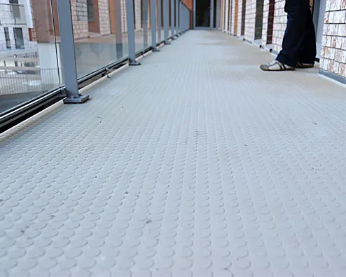 Het ruwe oppervlak zorgt voor betere grip bij gladheid door water. De groef tussen de noppen (rond 29 mm) voert het water snel af. De ruwe structuur en de waterafvoer voorkomen aquaplaning op een effectieve wijze. De ronde, fraaie uitstraling van GIAN 7 noppen geeft het beton iets zachts mee, waardoor deze structuur haast in elk gebouw toepasbaar is. |